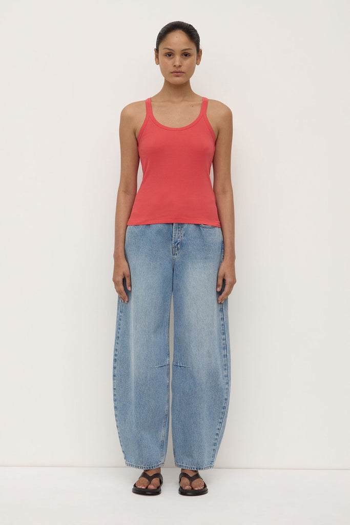 The Charlie Rib Tank in washed chilli is a soft cotton jersey top with a scoop neckline and ribbed stretch finish.