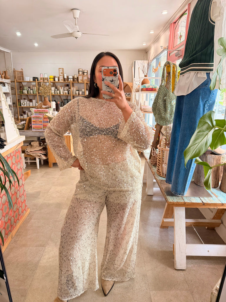 Sparkle the night away in our wide leg sequin pant!